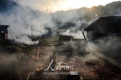 小廣侗家人結(jié)親嫁女的日子每年只有一個(gè),即為每年農(nóng)歷十月第一個(gè)卯日。小廣侗寨的婚禮,不辦嫁妝、不備彩禮、不花過(guò)多錢(qián)財(cái)、合符“勤儉節(jié)約”的要求,但整個(gè)婚禮卻充滿隆重的節(jié)慶氣氛。結(jié)婚當(dāng)晚,新郎和新娘一般見(jiàn)不到面,更不能入洞房,當(dāng)?shù)厝朔Q“不落夫家”。圖為11月16日,新郎家的親戚朋友在殺豬準(zhǔn)備婚禮所需食材。