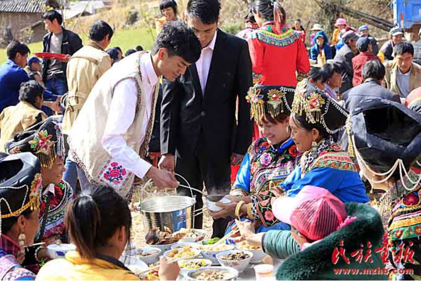 穿長(zhǎng)衫,戴著包頭的新郎,把新娘接入正堂屋,將送親的人群迎進(jìn)臨時(shí)搭建的青棚屋休息。青棚,是傈僳族人辦婚事時(shí)砍來(lái)毛櫟樹(shù)、香樹(shù)枝等臨時(shí)搭起的棚子。既清新又涼爽舒適??梢杂脕?lái)接待賓客,也可以作為跳舞、唱曲子的活動(dòng)場(chǎng)所。晚餐就在青棚里進(jìn)行,宴席一般不用桌子,酒菜擺在青棚下面鋪好青松毛的地上,客人八個(gè)一圈,席地坐在青松毛上,圍著喜筵,既歡樂(lè)又開(kāi)心的喝著美酒、品嘗佳肴。晚飯菜肴十分豐盛,足見(jiàn)主人家的好客和廚師的高超手藝。菜出雙不出單,菜的顏色出紅不出白。一切都象征著成雙成對(duì),吉祥如意。