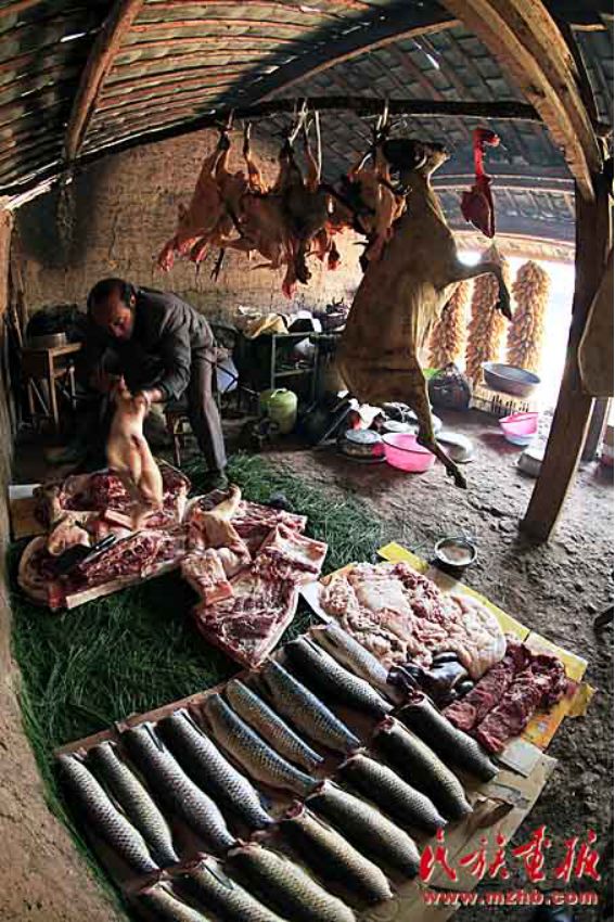 宴席一般不用桌子,酒菜擺在青棚下面鋪好青松毛的地上
