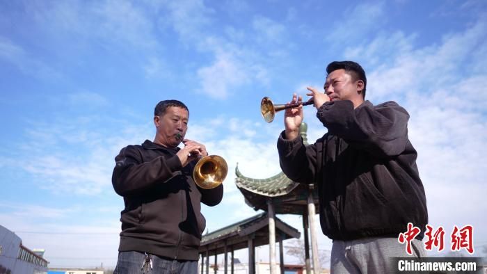 李曉盼(右)在吹奏嗩吶?!黔偂z