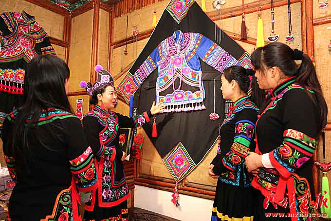 大姚縣咪依嚕民族服飾制品有限公司總經(jīng)理羅珺給職工講解彝族服飾文化