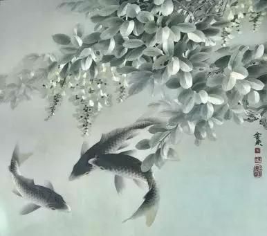 魚是蜀繡中的代表圖案。該繡品針法細膩,片線光亮,色彩典雅。紫藤花與水中的鯉魚動靜結(jié)合,相映成趣。