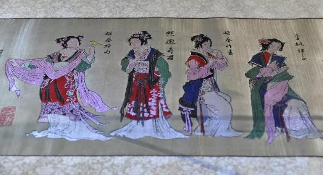 取材于唐代畫家張萱的畫作《虢國(guó)夫人游春圖》和《簪花仕女圖》,作品采用橫織豎裱的方式呈現(xiàn)。
