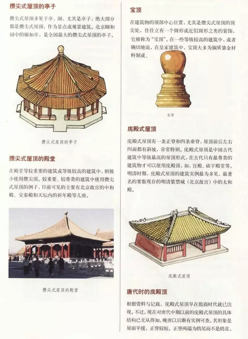 無正脊,只有垂脊,只應(yīng)用于面積不大的樓、閣、亭、塔等,平面多為正多邊形及圓形,頂部有寶頂。根據(jù)脊數(shù)多少,分三角攢尖頂、四角攢尖頂、六角攢尖頂、八角攢尖頂。此外,還有圓角攢尖頂,也就是無垂脊。攢尖頂多作為景點或景觀建筑,如頤和園的郭如亭、麗江黑龍?zhí)豆珗@等。在殿堂等較重要的建筑或等級較高的建筑中,極少使用攢尖頂,而故宮的中和殿、交泰殿和天壇內(nèi)的祈年殿等卻使用的是攢尖頂。攢尖頂有單檐、重檐之分。