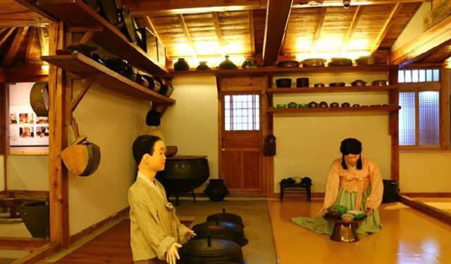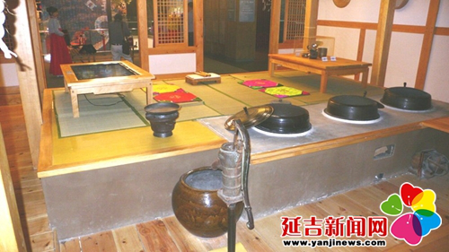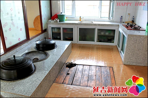 在傳統(tǒng)的朝鮮族民宅中,炕和鍋臺是平齊的,需要燒火做飯時,主婦會打開架在柜臺一側(cè)的移動木板,下到地面水平線以下的“灶坑”點火做飯。傳統(tǒng)的炕采用長筒式結(jié)構(gòu),煙火由一洞內(nèi)循環(huán)排出,使每洞都有煙火串入,炕即溫?zé)?。朝鮮族的火坑高度為30-40厘米,但炕洞向下挖入,炕面抹白灰,表面糊油紙或鋪草簾子,炕面平整。隨著物質(zhì)條件的改善,炕面改鋪纖維板或者地板膠,既美觀又耐用。