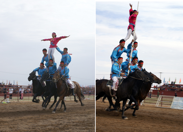 蒙古族的馬術(shù)表演非常精彩,有很多項(xiàng)目?!翱缭秸系K”是在運(yùn)動(dòng)場(chǎng)跑道上每隔幾十米設(shè)置一個(gè)高1米的跨欄。跑道終端立著一個(gè)直徑約2米的火圈,矯健的坐騎從起跑線踏蹄起跑,越過(guò)跨欄,鉆過(guò)火圈直達(dá)終點(diǎn)?!俺笋R斬劈”是在200-250米的距離之間樹(shù)起十幾個(gè)目標(biāo)。騎手們手持馬刀,疾馳如飛,經(jīng)過(guò)一個(gè)個(gè)目標(biāo)時(shí)舉刀劈砍,刀起標(biāo)落。“馬上技巧”是由運(yùn)動(dòng)員們?cè)陲w馳的馬背上做出各種造型動(dòng)作。運(yùn)動(dòng)員一般八九歲就要在馬術(shù)隊(duì)接受?chē)?yán)格的訓(xùn)練。技巧表演可分單項(xiàng)和多項(xiàng),其中又包括單人單馬、單人雙馬、雙人雙馬和多人多馬。一匹飛奔的馬經(jīng)過(guò)騎手身邊,騎手可以突然抓住馬鬃翻身上馬,又會(huì)突然下馬腳尖點(diǎn)地再躍上馬背。其他技巧還有在馬背上“空翻倒立”“側(cè)方隱蔽”“樓里藏身”以及驚險(xiǎn)的“馬上疊羅漢”等表演【如圖,劉軍攝影,編者修剪合成兩圖】。