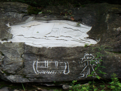 筆者在該村所見(jiàn)的具有“文化生態(tài)村”建設(shè)痕跡,除了村口巨石上鐫刻的文字外,還修建了一條貫通項(xiàng)目組專家們規(guī)劃的“文化生態(tài)展示區(qū)”的石板路,并在作為展示重要文化景觀的地方豎立了介紹或解釋性的文字標(biāo)牌。如,村口、山神廟前、摔跤場(chǎng)等都立有介紹的招牌。讓筆者疑惑和認(rèn)為不應(yīng)該“改造”的是在村民們的祖靈洞巖壁上的“藝術(shù)石刻”(見(jiàn)圖)。從筆者與村民的訪談和項(xiàng)目組的總結(jié)報(bào)告資料中,可以把文化生態(tài)村建設(shè)試點(diǎn)項(xiàng)目組在月湖開(kāi)展的文化保護(hù)工作歸結(jié)為如下幾個(gè)方面: