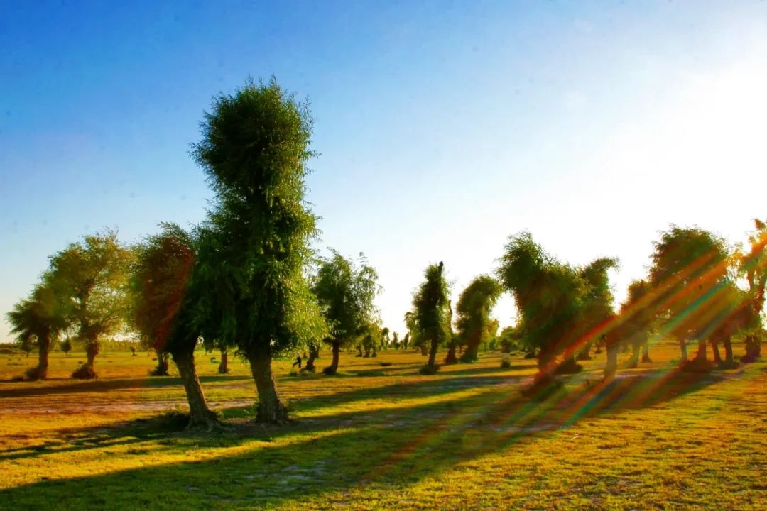 橫貫沙灘,百里藏幽,滿是綠蔭。望連綿古樹,遮天蔽曰,松榆椴橡,南北聯(lián)姻。翠鳥歡歌,繁花綻蕊,千眼噴泉四季吟。游人喜,嘆夢中仙境,絕妙園林。