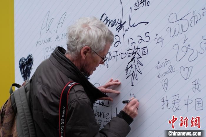 一名外國(guó)友人參觀畫展,并簽名?!⒖÷?攝