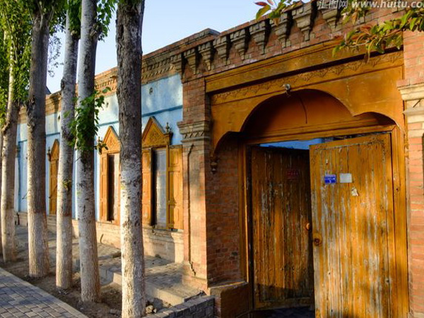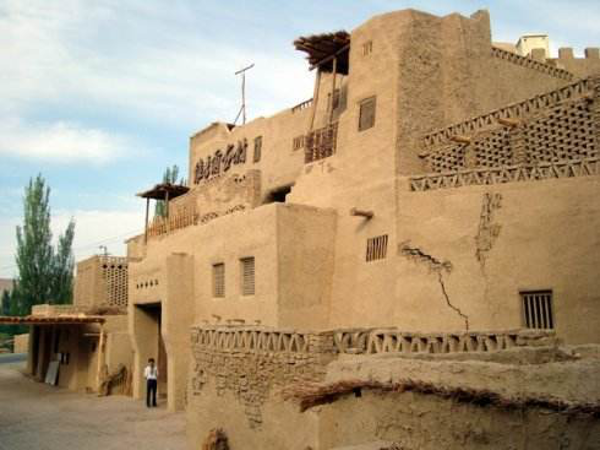 維吾爾族的居室一般是土木結構平房,其建筑方式是以粗木或沙石作基,土塊砌墻,或笆子墻,房頂架梁檁、椽后鋪葦席加土抹泥。房屋平頂,開天窗采光,四壁不開窗只留門,房門忌朝西。現(xiàn)在,建筑式樣發(fā)生變化,多留壁窗,建材也多由土木結構,向磚、混凝土結構發(fā)展。室內布置過去較為簡單,一般多砌土炕,炕一側隔矮墻砌鍋臺,墻上留有壁翕,放置物品,喜掛壁毯。冬季多燒爐子、火墻取暖。院內多植有葡萄和果樹花卉。房門口兩側砌土臺,上鋪氈毯,用以夏天乘涼、睡覺。