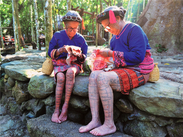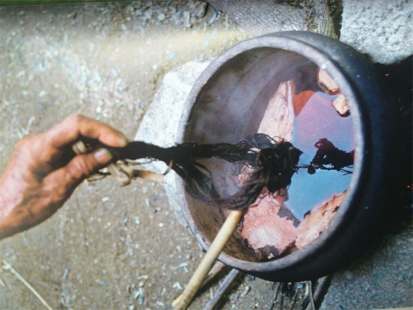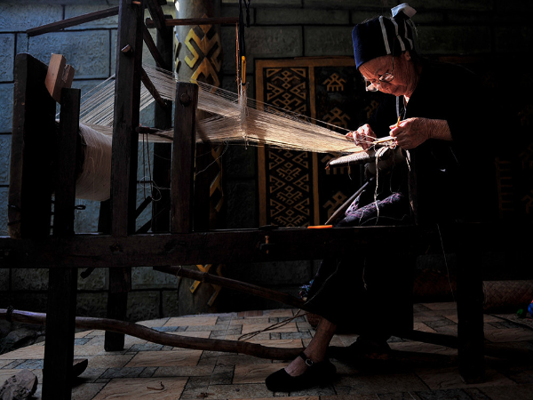 “織”是指使用踞腰織機(jī),采用通經(jīng)斷緯的紡織方法織出各種花紋圖案,在織布時(shí),先手工掛經(jīng),綁住藤或樹(shù)皮布腰帶,用腳踩織機(jī)的經(jīng)線木棍,席地而坐織布??椈ㄊ怯煤谏蛩{(lán)黑色做底線(經(jīng)線),根據(jù)圖案需要,將各種染色的線搭配,拉經(jīng)線、投緯線(彩色線),用木刀打緊緯線,織出各種花紋圖案。