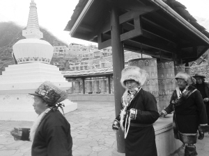 甘堡藏寨的村民們在轉經,他們的身后是“修舊如舊”的藏式民居