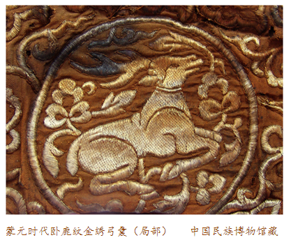中國民族博物館館藏的臥鹿紋金繡弓囊通長72CM,最寬處25CM,最窄處6.5CM。面料為絹地,呈深褐色。專家推斷其入土前應(yīng)內(nèi)襯樺樹皮或獸皮類框架。弓囊正面以銀裹金錢繡滿圖案,整體金碧輝煌。由于埋藏地下數(shù)百年,弓囊兩端的鐵質(zhì)穿環(huán)和皮條已銹蝕腐爛。
