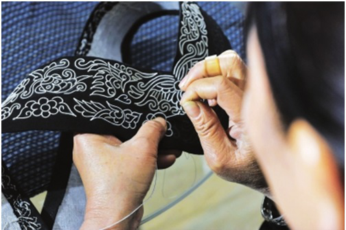 第三步是繪制圖案,即在做好的布殼上繪畫出刺繡所參照的圖案,這是制作馬尾繡的關鍵環(huán)節(jié)。其花樣繁多,精細而復雜,繪畫的好壞直接影響到馬尾繡的精美程度。