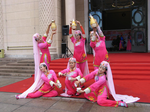 宴席曲:流行在中國西北地區(qū)回族、東鄉(xiāng)族、撒拉族、保安族的傳統(tǒng)習(xí)俗性舞蹈。是迎親時(shí)男方宴請女方送親者的宴席間演唱的歌舞形式。曲調(diào)優(yōu)美,節(jié)奏性強(qiáng);歌詞多敘述民間故事、傳說和一些幽默逗趣的內(nèi)容。舞蹈動作不配合歌詞具體內(nèi)容,只表達(dá)歡樂的情緒。宴席曲多為2—8人的男子對舞,相互換位后,有屈膝半蹲、雙手伏膝的行禮姿態(tài)。其基本步法一般是腳尖或腳掌先落地、膝部屈伸,使身體如波浪起伏,與頭部的擺動、顫動相協(xié)調(diào)。手勢有單晃手、雙晃手、掏手、望月等,舞姿灑脫昂揚(yáng),表現(xiàn)了高原民族豪放、開朗和詼諧的性格。