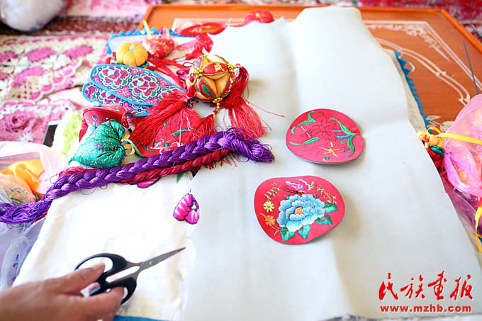 走進(jìn)她的家中,只見(jiàn)不大的房間中擺滿(mǎn)了荷包、繡花鞋墊、枕頭等刺繡品。桌上五顏六色的彩線(xiàn)旁,馬阿英社和兒媳婦正聚精會(huì)神地依著設(shè)計(jì)好的圖案“飛針走線(xiàn)”。