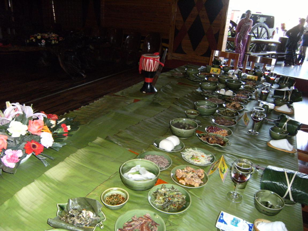 景頗族飲食大多帶有亞熱帶山林地區(qū)的特色和耕牧漁獵的民族文化氣息,如舂鱔魚、螺螄湯、酸筍燒魚、竹筒烤魚、砂鍋燉竹鼠、涼拌牛肚、煮芋頭、臭豆、酸木瓜炒牛肉絲、帕滾菜煮繁雞、水腌菜拌烤山鴿、鹿肉剁生、馬鹿干巴肉松、油炸知了肉丸、螃蟹夾、粘棗果、煮酸粑菜、軟米銅鍋飯等。特色菜酸筍燒魚烹飪時(shí)先將油燒至七成熱,放入洗凈去鰓的魚,炸至呈金黃色撈出控油。然后又在鍋中注入油,用蔥、姜、蒜熗鍋,烹入料酒、醬油、高湯,沸后下魚、酸筍、辣椒、味精、鹽、白糖、胡椒,收至汁濃時(shí)裝盤。舂鱔魚將鱔魚去頭去內(nèi)臟,蒜、姜拍松,香菜、荊芥切成末,鱔魚用炭栗火燒成金黃色,辣椒炒熟透,切成米粒。最后將鱔魚舂細(xì),放入配料,調(diào)料舂細(xì)裝盤。