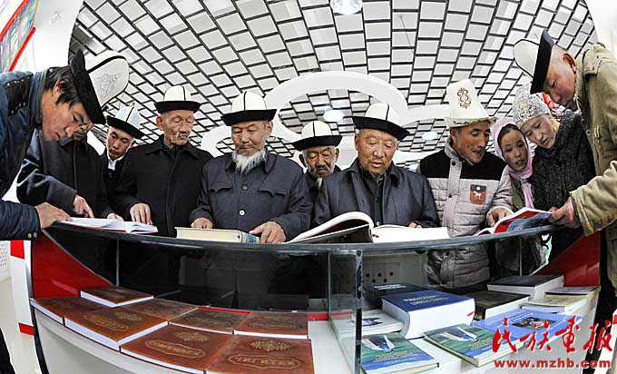 阿合奇縣哈拉布拉克鄉(xiāng)《瑪納斯》博物館里,人們在翻閱有關(guān)瑪納斯的作品