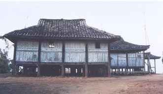 鎮(zhèn)康地區(qū)若干小家庭同住一幢房子,房?jī)?nèi)中間有寬敞的走道,兩旁為各小家庭住室,間壁而居,各有火塘,所以竹樓較大,有的占地近四百平方米。這種干欄式長(zhǎng)方形大屋居住形式源于過(guò)去德昂族地區(qū)仍保留父系大家族社會(huì)組織,也就是說(shuō)有血緣關(guān)系的后代都共同居住在一所大房子內(nèi),房屋的大小要依據(jù)家庭成員多少而定。雖然隨著社會(huì)的發(fā)展和大家庭生活方式的改變而瓦解消失,但在解放初期還能看到它們的遺址或縮小了的原型。
