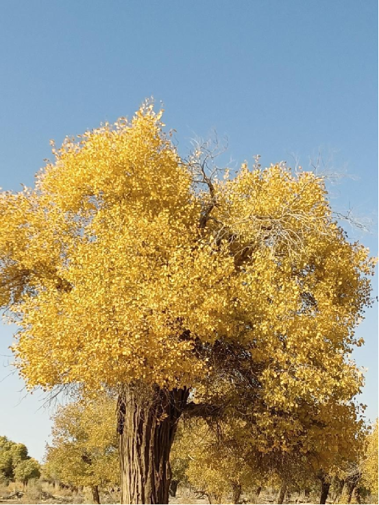 每當(dāng)深秋季節(jié),胡楊樹葉變得一片金黃,形成胡楊秋色,樹影婆娑,奇妙絕倫,賞心悅目。漫步在濃郁的胡楊林中仿佛進(jìn)入神話般的仙境。茂密的胡楊千奇百怪,神態(tài)萬般。粗壯的幾人難以合抱,挺拔的七、八丈之高,怪異的似蒼龍騰越,似虬蟠狂舞,令人驚奇不已,嘆為觀止。僅就密密匝匝的樹葉,也是風(fēng)采獨有。幼小的胡楊,葉片狹長而細(xì)小,宛若少女嫵媚的柳眉,人們常常把它誤認(rèn)為柳樹;壯齡的胡楊,葉片又變成卵形、闊卵形或三角形,猶如興安嶺的白樺;進(jìn)入老年期的胡楊,葉片才定型為橢圓形。更令人稱奇者,在同一棵胡楊樹冠的上下層次,還長著不同形狀的葉片,因此,又稱“異葉楊”
