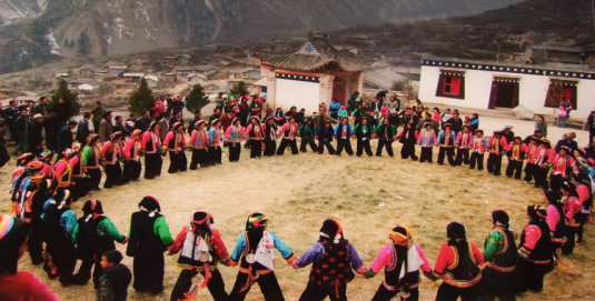 多地舞的動作以腰以下部位為多,經(jīng)常出現(xiàn)“一順邊”的美,即手和腳同出一側(cè)形成“一順兒”。許多舞蹈中女性以身體俯仰、臀體轉(zhuǎn)動為特色,顫膝擺胯,微動肩胸,上身較為平穩(wěn),上肢開張幅度不大,合著腳步和節(jié)奏律動,較為突出地表現(xiàn)了女性胸部之凸顯、腰部之柔軟、臀部之豐腴。舟曲藏民族的女性舞姿顯出了山地藏民族腆靜、文雅、內(nèi)秀的性情。