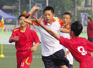 19日舉行的開幕式文藝表演《鼓舞你我他》,特別突出了體育元素和民族元素的結合,1000余名來自北京市各行各業(yè)的非專業(yè)演員參與演出。(上圖為運動會開幕式現(xiàn)場;下圖為運動會綾球比賽現(xiàn)場。)