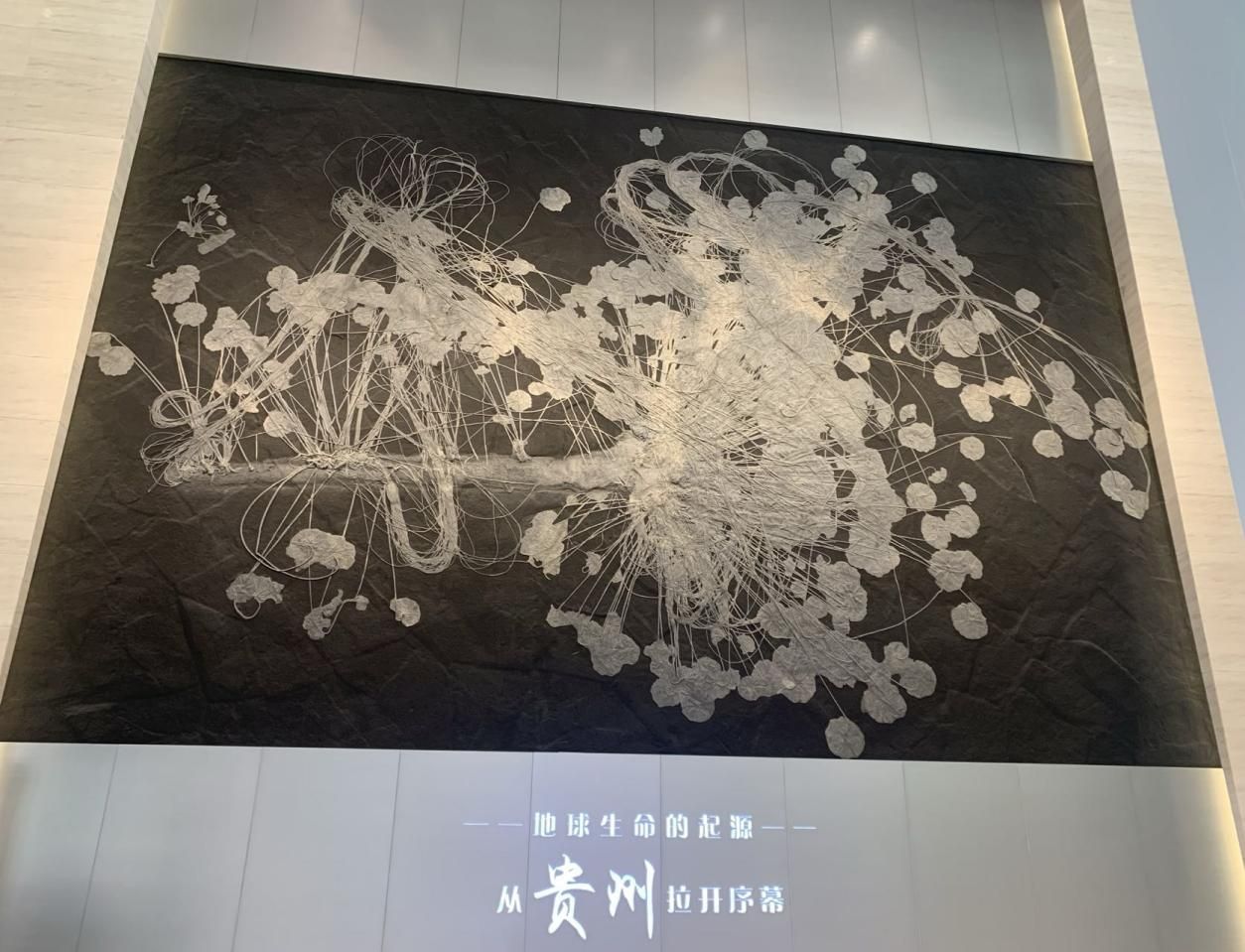 走進(jìn)序廳,左側(cè)墻面的巨幅海百合化石,格外引人注目。這幅關(guān)嶺創(chuàng)孔海百合,是目前已知自然產(chǎn)出面積最大、保存最精美的海百合生態(tài)化石標(biāo)本,長(zhǎng)12.5米,寬8.2米,面積高達(dá)102.5平方米,重約2.5噸,由一大、一小兩組完整的海百合假浮游生態(tài)群落組成。