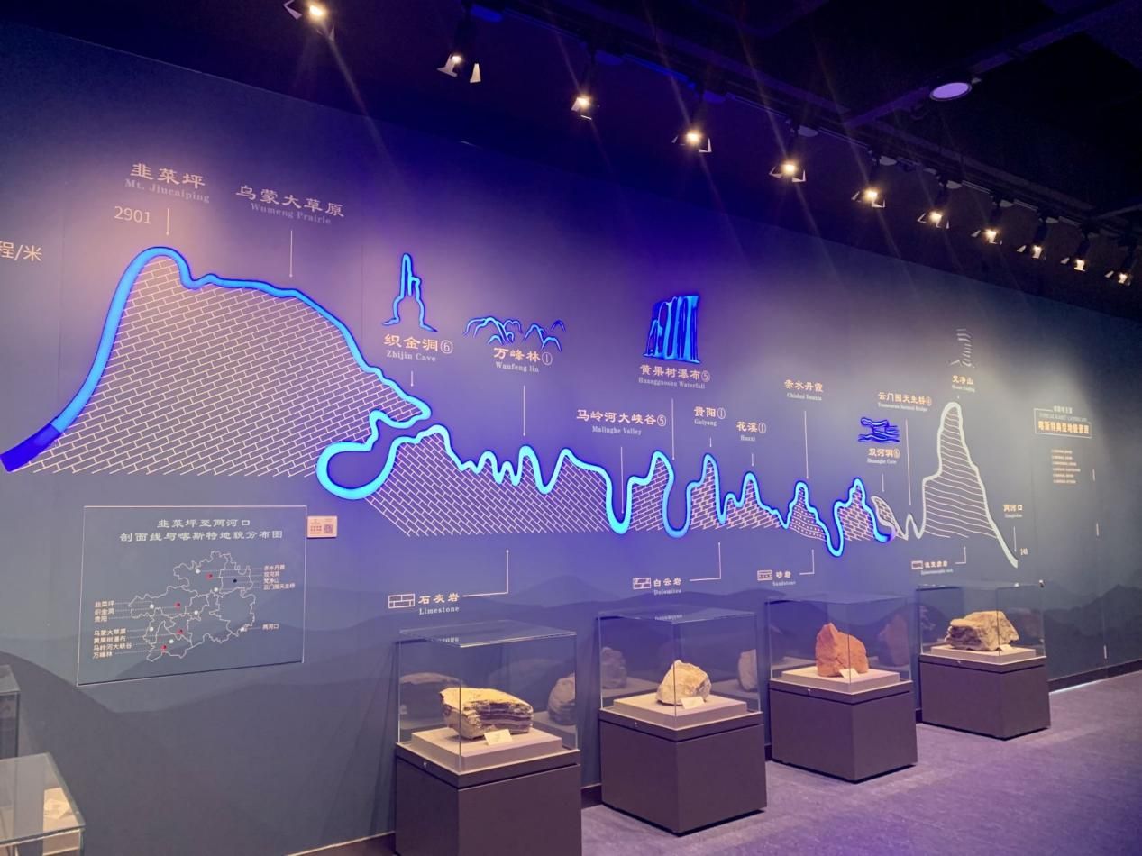 “多彩貴州”展廳以“喀斯特王國(guó)”為主題,分為“滄海變遷”“追根溯源”“經(jīng)典地貌”“地質(zhì)旅游”四個(gè)部分,運(yùn)用聲光電、場(chǎng)景復(fù)原、油畫、沙盤等展示手段,再現(xiàn)貴州“喀斯特王國(guó)”的各類地質(zhì)景觀,大自然的鬼斧神工。