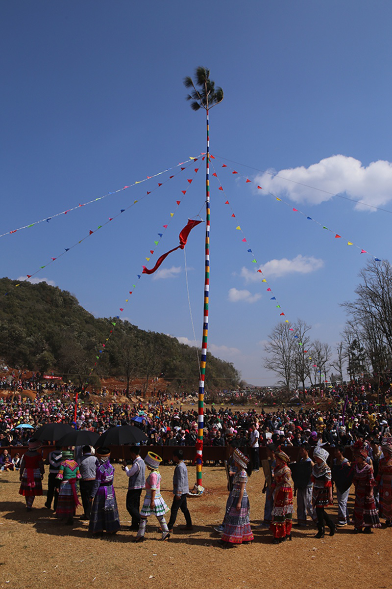 節(jié)日承載著民族的歷史文化和共同記憶。花桿祭祖的儀式便是一種活態(tài)的歷史敘事和傳播,分為立桿、祭桿和收桿。立桿是在節(jié)日開始前,選兩棵異體同根、高而直的松樹,一公一母,擇吉日把花桿頭朝著太陽升起的東方豎起來,立在花山場。苗族人認為祖先居住的地方是太陽升起的地方。祭桿時由村中長老和巫師帶頭,圍繞花桿順時針方向走三圈,同時獻上祭品,念頌咒語,祈愿祖先保佑。收桿是在節(jié)日結(jié)束時將花桿頭朝日落的方向放下,人們會搶著摘一把松枝回家,求子求福、保佑平安,放下的花桿將被村民妥為保存。