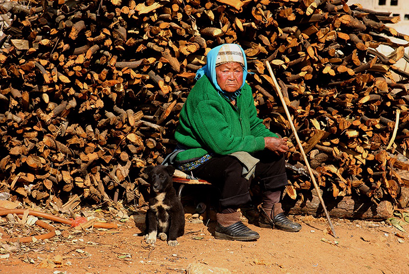 2月初的丘北,連日陰雨,是一年中最冷的時節(jié)。我先于拍攝團隊幾天到了村里,想獨自在這里轉(zhuǎn)轉(zhuǎn),熟悉一下村民,篩選一下拍攝的人物。正當我在一個泥濘的岔路口徘徊,尋思著是否要問路去村主任家的時候,旁邊屋子里走出一個人,面容親善:“天好冷啊,進來烤烤火吧!”他打招呼的方式如同熟人,一笑時露出兩排又白又整齊的牙齒。于是,他家擁擠的火塘邊又多了一個人。大家圍著火爐有一搭沒一搭地聊天,語調(diào)溫和小聲,沒話的時候大家也不覺得別扭,只聽見玉米骨在火塘里噼啪作響。這是一個五代同堂的大家庭,招呼我的主人楊樹紅和妻子以及祖母、父母一起生活,兒子和女兒在廣東打工,已經(jīng)回村準備過節(jié),兒子未婚,女兒則有了兩歲的孩子。楊樹紅的祖母出生于1922年,是這個村子里最老的老人,耳朵有些背。我大聲問她是否還記得年輕時候踩花山,她拍著我的手背說:“17歲我就去踩花山嘎!好玩嘎!”兒媳笑著解釋說:“估計她說的是17歲踩花山的時候碰到爺爺,被他拖媳婦拖走的事呢?!弊婺改昙o太大,看著她手上和臉上深深的褶皺,不知藏了多少往事。