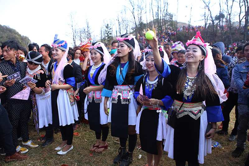 由于在歷史上經(jīng)歷長時間、大范圍的遷徙,苗族文化形成了較強的環(huán)境適應能力和流動變遷特征。節(jié)日作為民族文化的凝集點,慶祝方式和形態(tài)也處于動態(tài)的演變和傳承之中。在大布紅的花山場,一個從老撾過來的苗族女子樂隊讓當?shù)氐拿缱迦烁械胶闷妗f著同樣的西部苗語,卻穿著略顯不同的衣服。她們排成一行,教人們一來一往地扔繡包,一時間圍觀者無數(shù)。不消多久,女子樂隊手中的CD就在人群中銷售一空。