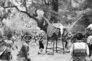 每年農(nóng)歷正月初二至十五花山節(jié),主人與遠道而來的客人共同歡慶。他們圍成一圈,喝著燒酒,跳起歡快的苗家舞蹈,唱著動聽的民歌,一天的勞頓、一年的艱辛,被熱烈的燒酒驅(qū)趕著,被歡愉的歌舞浸潤著,被悠揚的蘆笙旋律激蕩著。蘆笙、燒酒、蠟染,精美古樸的苗族服飾,木槽里錘打的糍粑……與四周山山水水一同融匯,幻化成一個民族的標識。