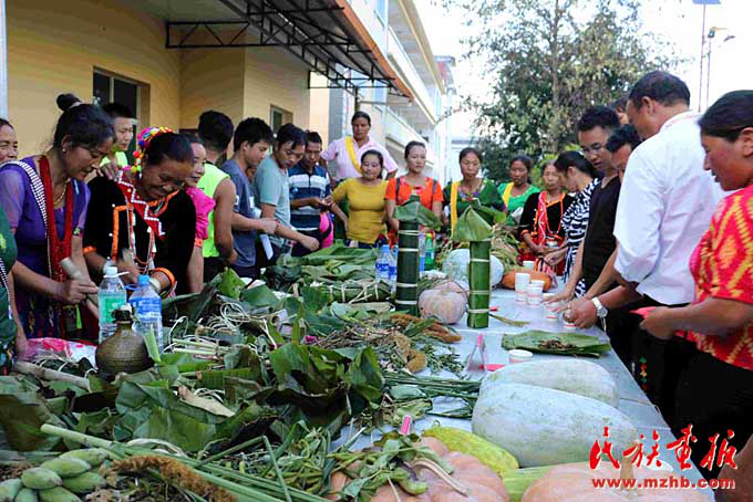 尚立文向記者介紹說:“以前景頗族過年,大年三十,一部分男人在家殺年豬,其余的就上山打獵。景頗族很慷慨,凡是獲取到的獵物,見者都有份。女人除了在家準(zhǔn)備年夜飯,也會上山或下壩子采野菜等。但不管是打獵的還是摘野菜的,都必須在太陽落山前到家,闔家歡度春節(jié)吃年夜飯。現(xiàn)在生活好了,不打獵不摘野菜了,但還是得遵循太陽落山之前到家的習(xí)俗?!?/p>