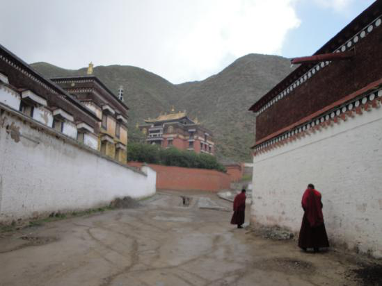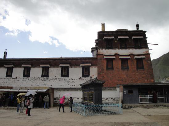 在狹長(zhǎng)的盆地上,各式建筑星羅棋布,金瓦紅墻,雕梁畫棟,華麗非凡。僅圍墻就長(zhǎng)達(dá)3公里余。五百多間連續(xù)回廊及一千多個(gè)“嘛呢轱轆”,將寺院與外界隔絕。整個(gè)寺院外部墻垣、院地、臺(tái)階均以石砌為主,內(nèi)部戶限、柵欄、棟梁、門栓均以木料為主,故有“寺院外不見木,內(nèi)不見石”的說法。