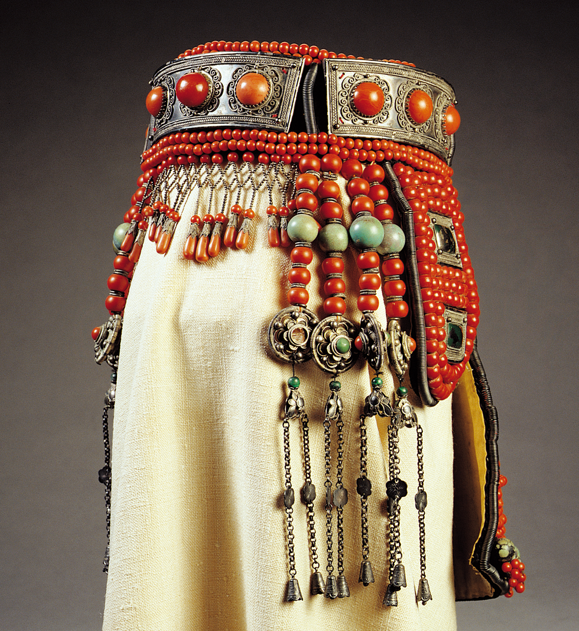 草原上,婦女們平時(shí)一般多罩頭巾。頭巾大約丈余長(zhǎng),顏色多種多樣。質(zhì)料有布、麻、綢、絹等。姑娘們喜歡將頭巾纏在頭上,然后在右側(cè)挽一個(gè)小結(jié),把頭巾的穗頭垂下來(lái)。已婚婦女們則用頭巾包住頭頂后,纏一圈,不留穗頭。在莊重的場(chǎng)合還要戴上繡有丹鳳朝陽(yáng)、二龍戲珠等花紋圖案的帽子。帽頂上有紅色穗子和閃光明亮的帽頂寶石。傳說(shuō)這種習(xí)俗始于成吉思汗時(shí)期。當(dāng)初成吉思汗統(tǒng)一蒙古各部落之后,下令每個(gè)人都要罩頭巾,以表示頭顱上飄有旌旗之角,希冀民族強(qiáng)大之精神常在。從結(jié)婚、告別姑娘生活的那天起,婦女們便開(kāi)始佩戴雍容華貴的盛裝首飾。而蒙古族的盛裝頭飾,以鄂爾多斯地區(qū)最為典型。這種頭飾漢譯為“頭戴”,主要由“連垂”和“發(fā)套”兩部分組成。不僅制作工藝精湛,而且多用數(shù)百顆珊瑚、數(shù)十條銀鏈、珍珠串和許多銀環(huán)、銀片以及瑪瑙、玉石等穿綴而成。裝扮起來(lái)可謂珠簾垂面、琳瑯滿(mǎn)目。一副頭戴一般都重達(dá)三四斤,有的可達(dá)十余斤。據(jù)說(shuō)一副高檔頭戴,過(guò)去往往要用幾群好馬或數(shù)百峰好駝才能換取。