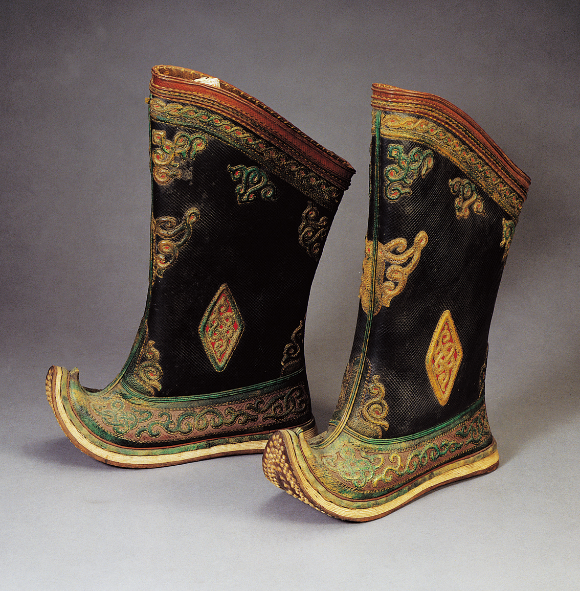蒙古人愛(ài)穿靴子,蒙古靴分布靴和皮靴兩種。布靴多用厚布或帆布制成,穿起來(lái)柔軟、輕便。皮靴多用牛皮、馬皮或驢皮制成,結(jié)實(shí)耐用,防水抗寒性能好。其式樣大體分靴尖上卷、半卷和平底不卷的三種,分別適宜在沙漠、干旱草原和濕潤(rùn)草原上行走。蒙古靴做工精細(xì)考究,靴幫、靴靿上多繡制或剪貼有精美的花紋圖案。