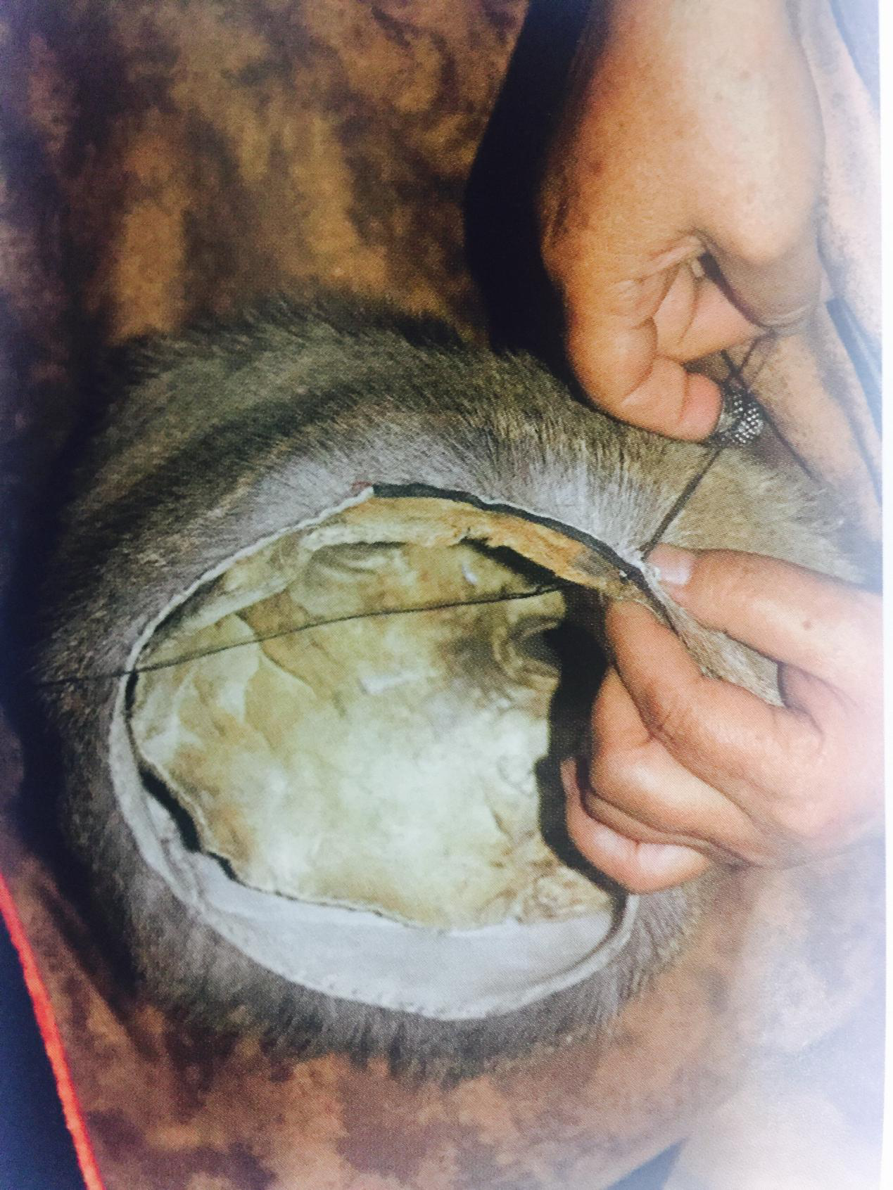 狍角帽是用整狍子的頭顱,去掉骨肉后,保留狍頭上的毛、角、耳朵、鼻子和口,精心鞣制而成。主要制作流程是:剝皮,清洗、熟皮,定型,補(bǔ)眼睛、刺繡、制作繡片,縫合護(hù)耳與頭皮,制作里襯。制作時,如何剝得完整的頭皮,是整個制作環(huán)節(jié)的關(guān)鍵。
