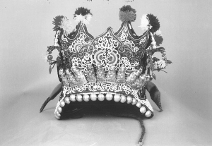 繡花帽由里外兩部分組成,素有“制做繡花帽,先做好襯套”之說(shuō)。即先按兒童頭徑大小制襯套,做法較簡(jiǎn)單,用染過(guò)的家織布做里襯,鋪上薄棉,外層為紅綢面,用線依次納緊,以防棉花下滑,縫成筒狀后,頂部用同樣的材料剪成四方形,與上部帽沿結(jié)構(gòu)相同即成。后部分較前部分復(fù)雜,先將染過(guò)的兩層家織布粘牢,表面貼上各色緞面,顏色自定。把圖樣拓在緞面上,剪下形狀不同的6片材料,把喜愛的圖案描繪在上面,接著用紡車紡出6根各4米長(zhǎng)的棉線,用吊砣逐根旋轉(zhuǎn)纏繞白色呢絨線,經(jīng)濃縮,每根僅得到1米左右線料,將這制好的精線按圖案盤弄,后以花針固定,再輔以其他色線刺繡成圖案點(diǎn)綴其間。把繡好的6片材料組合到襯套上,各片邊沿用黑白兩色線交替鎖邊,帽口用黑金絨布滾邊。此時(shí),帽頂?shù)模吨患饨怯貌噬€制做成圓球裝飾,外面四角下面懸吊白色珍珠串,末端垂著布制五角星。帽的周邊釘上銀制品,最后鑲上反光小圓點(diǎn)飾物似天上星星般光亮,給本就精致美觀的繡花帽增添了一道靚麗色彩,繡花帽就這樣在侗家女的手中誕生了。