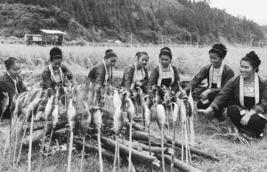 廣西三江侗族自治縣舉辦高山稻魚(yú)文化節(jié),當(dāng)?shù)氐某檀?、良口、富祿等鄉(xiāng)鎮(zhèn)以稻田抓魚(yú)、烤魚(yú)、風(fēng)情表演等活動(dòng),吸引游客前往體驗(yàn)原汁原味的侗鄉(xiāng)稻魚(yú)文化,樂(lè)享金秋豐收喜悅。近年來(lái),該縣傾力推進(jìn)“種稻養(yǎng)魚(yú)”特色產(chǎn)業(yè),將傳統(tǒng)優(yōu)勢(shì)轉(zhuǎn)化為資源優(yōu)勢(shì),并大力發(fā)展生態(tài)鄉(xiāng)村游,推銷(xiāo)高山生態(tài)健康食材,使群眾脫貧增收。圖為當(dāng)?shù)厣贁?shù)民族婦女在該縣富祿苗族鄉(xiāng)富祿村稻田內(nèi)烤魚(yú)。