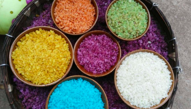 花糯米飯是先用各種植物的根、莖、葉、花經(jīng)石臼沖搗細(xì)碎后,用水浸泡或煮沸一定時間,成為不同顏色的汁液。再用這些汁液分別浸泡淘洗干凈的糯米,使其著色,蒸熟后即成不同顏色的糯米飯。其色彩有黑、紅、黃、綠、紫、白(大米本色)等六七種。一般取五色為多。