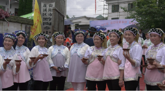 布依族青年們抬著族中神物銅鼓,吹著長長的號角,臉上滿是對民族節(jié)日的期待之情,驕傲又興奮;成群結(jié)隊的孩童穿著本民族傳統(tǒng)服飾,手拿錦帶,熱忱歡迎遠道而來的客人;能歌善舞的布依阿姐笑臉相迎,唱著布依族的歌謠,一字排開堵在門前,客人們想要進去參加這次盛會,就得過三關(guān),干了三碗攔路酒。