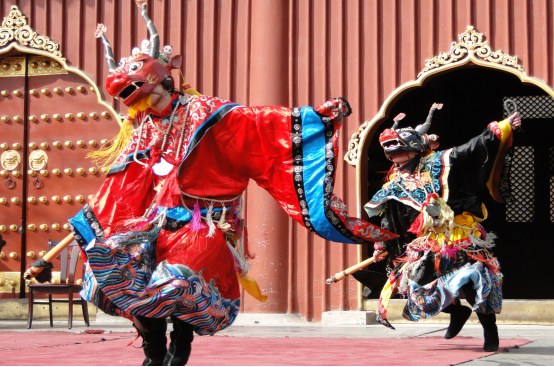 查瑪樂(lè)舞從整體上看應(yīng)包括內(nèi)查瑪、外查瑪、索日扎拉火(也稱送祟)三個(gè)部分組成?!皟?nèi)查瑪”中的“內(nèi)”是指寺院的殿堂內(nèi)進(jìn)行的樂(lè)舞表演,一般為1至4人?!巴獠楝敗敝械摹巴狻笔侵傅钐弥猓卜Q“呼日耶查瑪”(廣場(chǎng)查瑪),表演的人數(shù)較多,規(guī)模最大。“索日扎喇火”中“索日”是象征魔鬼的面俑,“扎喇火”是迎請(qǐng)的意思,在這一部分中主要是焚燒“魔鬼”,以此來(lái)象征破除所有魔障的意思。其中外查瑪不僅規(guī)模最大,有嚴(yán)格的表演程序、角色、內(nèi)容和象征涵義。代表性角色有:綠度母、阿薩日(也稱螺神)、骷髏(蒙語(yǔ)稱郝布海)、閻羅法王(也稱護(hù)法神)、蝶神(也稱尸陀林神)、鹿神、白老翁等等。表演形式有獨(dú)舞、雙人舞、四人舞等。主神的表演多采用獨(dú)舞形式,節(jié)奏徐緩、動(dòng)作緩慢且典雅。雙人舞與四人舞的舞蹈動(dòng)作較歡快跳躍,多有激烈的搏斗或跑動(dòng)動(dòng)作和場(chǎng)面。