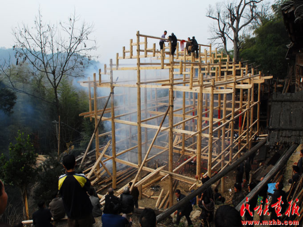 建房是人生中的一件大事,同時(shí)也有許多講究和說(shuō)法。準(zhǔn)備建房材料時(shí)首先要選取上乘的中柱。在砍伐中柱時(shí)需準(zhǔn)備香燭、紙錢、酒、魚(yú)、糯米飯到樹(shù)下祭奠,主人先砍幾斧,再由其他親友砍伐。備好的材料經(jīng)曬干、推刨后由木匠發(fā)墨。發(fā)墨時(shí)主人在木柱一端執(zhí)線,木匠在柱上拉直用力一彈,墨線筆直均勻,則表示吉利,否則還要重新發(fā)墨。立房是家中的一件大事。一般立房架和上梁同日進(jìn)行,屆時(shí)族人都會(huì)來(lái)幫忙,他們齊心協(xié)力把新房立起來(lái),來(lái)參加立房架儀式的親戚朋友都會(huì)帶禮品來(lái)慶賀。立大門時(shí)要?dú)⒁恢还u祭祀。待蓋房、裝飾等完成之后再擇吉日喬遷。