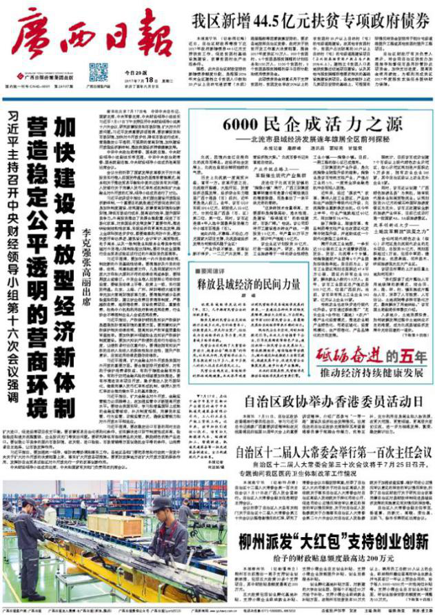 《廣西日報》立足廣西、面向全國,國內(nèi)外公開發(fā)行。目前,星期一至星期五每日出版對開12版,星期六、星期日出版對開8版,彩色印刷,是廣西第一大綜合性日報。新聞信息容量大,??笨鄻?,適應(yīng)多層次讀者需要,集指導(dǎo)性、權(quán)威性、科學(xué)性、服務(wù)性、實用性、知識性和趣味性為一體。