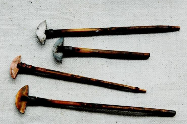 繪制蠟花的工具是一種特制的銅刀,而不是毛筆,因為毛筆容易被蠟冷卻凝固。這種銅刀是用兩片或多片形狀相同的薄銅片組成,一端縛在木柄上。刀口微開而中間略空,以易于蘸蓄蜂蠟。根據(jù)繪畫各種線條的需要,有不同規(guī)格的銅刀,一般有半圓形、三角形、斧形等。蠟染的基本原理是在需要白色花型的地方涂抹蠟質(zhì)(古代是蜂蠟,現(xiàn)代是石蠟、蜂蠟、木蠟等混合蠟),然后去染色,沒有涂蠟的地方染成藍色,有蠟的地方呈現(xiàn)白色,行話叫做“留白”。