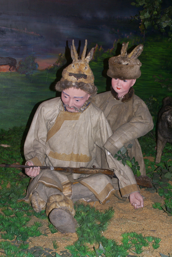 狩獵經(jīng)濟(jì)在鄂倫春族社會(huì)中維持了幾千年,一人一匹獵馬一桿槍,再加上幾條獵狗和一片獵場(chǎng),幾乎就是鄂倫春族的全部生產(chǎn)力。而槍支的傳入也不過(guò)才300多年的歷史,在此之前使用石塊和木棒狩獵,后來(lái)發(fā)明了扎槍和弓箭,與外界幾乎隔絕,純粹的食獸肉、衣獸皮。鄂倫春族最早使用的獵槍是被稱做“俄羅斯鳥槍”的火槍,這是清朝的察邊官吏、外民族及俄國(guó)商人交換給他們的。有火繩槍、火鐮槍和泡子槍三種,都是從槍筒裝入火藥或鉛彈,只是引爆方式不同。民國(guó)以后陸續(xù)傳入俄國(guó)造的連珠式和“三八”式、“七九”式等現(xiàn)代步槍。槍支的傳入,使鄂倫春人有了剩余產(chǎn)品,于是出現(xiàn)了交換經(jīng)濟(jì)。每年五月的“楚勒罕”集會(huì)時(shí),鄂倫春、鄂溫克、達(dá)斡爾等狩獵民族要向清廷貢貂,經(jīng)朝廷官員檢驗(yàn),不合格者可以在集會(huì)上進(jìn)行互市。此時(shí),他們也帶一些其他的獵產(chǎn)品及手工藝品進(jìn)行交換。由于鄂倫春人所貢貂皮質(zhì)量最好,故朝廷對(duì)他們采取了特別的納貂辦法:每年派一名專職人員到鄂倫春地區(qū)代表官府征收貂皮、發(fā)放賞賜。這些專職人員被稱為“諳達(dá)”,他們代表官府征收貂皮的同時(shí),也自帶一些糧食、布匹和其他生產(chǎn)、生活用品與鄂倫春人進(jìn)行私下交換。后來(lái),“諳達(dá)”變成了泛指進(jìn)山進(jìn)行獵產(chǎn)品收購(gòu)生意的所有商人。“諳達(dá)”與鄂倫春人進(jìn)行交換時(shí)從不計(jì)價(jià),而是以“馬馱”為計(jì)量單位,雙方以同樣一馬馱的物品進(jìn)行互換,或者采取包干制的辦法,一個(gè)“諳達(dá)”固定幾個(gè)包攬戶,按期供給他們生產(chǎn)和生活必需品,包攬戶將所有的剩余產(chǎn)品交于“諳達(dá)”。隨著貨幣經(jīng)濟(jì)的發(fā)展,清末時(shí)期,鄂倫春族周邊地區(qū)出現(xiàn)了眾多商號(hào)商鋪,這些商號(hào)(鋪)的老板被稱為“老客”,他們同鄂倫春人進(jìn)行計(jì)價(jià)交換。同時(shí)還出現(xiàn)了一些進(jìn)行計(jì)價(jià)交換的行商,被稱為“跑老客”。鄂倫春人雖然受到“諳達(dá)”、老客和跑老客的瘋狂欺詐和層層盤剝,但在與他們的交換中,卻自覺或不自覺地打開了封閉的自然經(jīng)濟(jì)大門,朝著商品經(jīng)濟(jì)邁進(jìn)了一步(鄂倫春博物館展覽攝影:劉軍)。