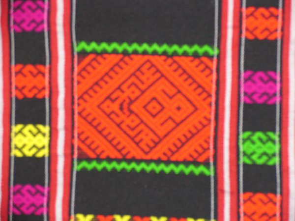 黎錦花紋圖案豐富多彩,多達(dá)百余種。較有代表性的圖案有人物類圖案、動(dòng)物類圖案、植物類圖案、天體類圖案、器物類圖案、文字類圖案。其中,“人物類圖案”是黎錦的基本核心、中心圖案,它在各種織錦中永遠(yuǎn)居于中心位置,形成中心紋飾,其他圖案可根據(jù)需要,或放在它的周邊,或放在它的第三、第四等位上。人物類圖案有單個(gè)的,也有多個(gè)組合的,有全身的,也有半身和頭像的;同時(shí)也有復(fù)合圖的。復(fù)合圖像上,有三重人物圖像嵌套,大套中,中套小,形成復(fù)合效果,構(gòu)圖復(fù)雜,工藝精湛。人物類圖案即祖先紋或鬼紋,黎族民間管這類紋樣叫做“剖”、“登”,即“祖先”或“鬼”的意思。黎錦中的人物紋樣的定位,反映了黎族人的濃厚的祖先崇拜意識(shí)。