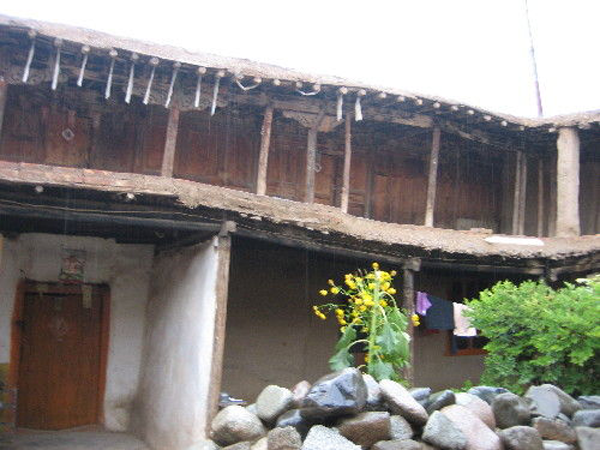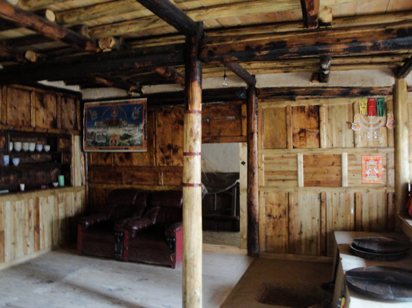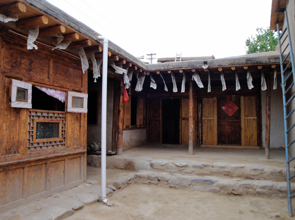 為改善狹小的寨內(nèi)空間,當(dāng)?shù)鼐用窬藿硕幽窘Y(jié)構(gòu)樓房,和青海鄉(xiāng)村民居庭院寬敞的特點(diǎn)形成了反差。寨內(nèi)民居庭院多為四合院式,房屋為土木結(jié)構(gòu)平頂房,一般民居都有飛椽花藻之類。屋內(nèi)一般以木板作隔扇,室內(nèi)有護(hù)炕木板、護(hù)墻木板墻圍,且多雕花草于其上。房屋一般面闊三間,正面以木板隔墻并裝上木板條方格小花窗。佛堂設(shè)在二樓,佛堂所在的房屋一般都是上房,和佛堂不同向的兩邊廂房一般做臥室。院落中央一般都有豎掛經(jīng)幡的旗桿,還設(shè)有桑臺,具有明顯的藏式特點(diǎn)。
