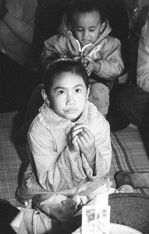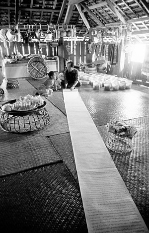 這時,走來一個大佛爺和兩個老人,因?yàn)榉鹱娌粫_口說話,他們是來替佛祖給玉波念“薩拉帥”祝詞的。先由大佛爺念了一段《祝福經(jīng)》,給玉波滴了水,然后兩個老人打開玉波那寬半尺、長足有7米多的“薩拉帥”祝詞。玉金說,這祝詞是請曼降村的前大佛爺康朗寫的(康朗:指佛爺還俗的人)。來倆個老人念,是考慮到可以換著念。玉波的奶奶也想到了玉波可能跪不習(xí)慣,就帶來了墊子,讓玉波或跪或坐,因?yàn)槟钔曜T~要兩三個小時。祝詞的內(nèi)容大致是這樣的:“我是一個在菩提樹下長大的女孩,在佛祖的護(hù)蔭下,臉長得像菩提樹葉一樣又嫩又青,身材像檳榔樹一樣苗條好看,心像金鹿一樣善良。當(dāng)我年滿12歲以后,人世間的喜樂情愛,貧窮苦難就會來到我的面前。今天在父母的幫助下,我準(zhǔn)備了這些物品來賧給佛祖。我千祈禱萬祈求,希望佛祖保佑我織布是行家,丈夫種田是能手。命里見火能親,遇水能溶。生的孩子女的長得像一只蜜蜂,男的長得像一頭水牛,用他們的勤勞贍養(yǎng)雙親。從小就聽話,自幼就很乖。在母親的懷里不亂哭,在父親的背上不亂搓……”