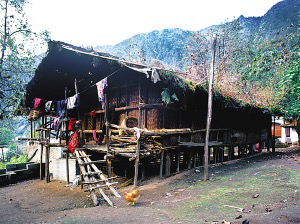 在怒江上游峽谷聚居的傈僳村寨都建在高山的半山上,其民居俗稱為“千腳落地房”。說“千腳落地”雖有些夸張,但也足以形象地說明峽谷溫?zé)岬臍夂蚝蜕礁咂露傅牡乩項l件。在雨季時,“千腳”阻力最小,使山洪順利傾瀉而下,又很快干爽,免受潮氣。而且不需挖地動土,不必移石砌墻,對木料沒有過高要求,長短皆用,在生態(tài)脆弱的高山峽谷也算環(huán)保建筑?!扒_落地”是因建房時先在確定的屋基上依斜坡程度和住房面積打進(jìn)數(shù)十根到百余根木樁為基樁,以保證居室樓板的平正?;鶚洞蚝煤?,除四面留幾根高柱作為整個房屋的立柱外,在密集木樁所形成的平面上滿鋪竹篾編織的樓板,還有竹篾圍墻,所有結(jié)構(gòu)皆用竹篾綁扎。屋頂鋪苫草或蓋木片瓦,近幾年,已陸續(xù)換上了大塊的水泥波形瓦。房門開在山墻一側(cè),有廊道,可做曬臺,平時穿的衣服都搭在這兒,也是婦女做針線活的地方。隨著怒江峽谷的開發(fā)和新農(nóng)村建設(shè)的深入,通路的村寨將很快會改變面貌。